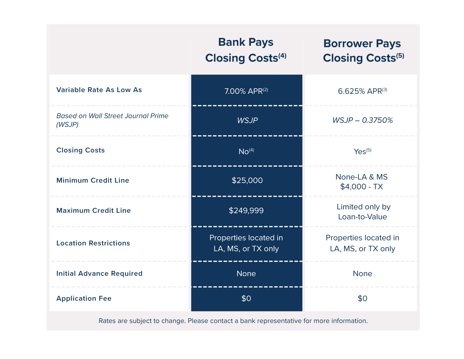1) Home Equity Lines of Credit (HELOCs) are available to qualified consumer applicants on new HELOCs for owner-occupied conforming residential real property in first or second lien position, up to an 85% maximum loan to value (LTV) for primary residences in Louisiana and Mississippi and 80% maximum LTV in Texas. Offer is not available on refinancing of existing Home Bank debt. Second liens may not be written behind an existing HELOC. The line of credit may not be used to purchase property being used as collateral. The term of this revolving line of credit is 25 years (first 10 years: interest-only payments; last 15 years: principal and interest payments). No draws in last 15 years when Home Bank pays the closing cost. There is no minimum credit line amount if the borrower pays closing costs in Louisiana and Mississippi and a $4,000 minimum credit line in Texas. Rescission rights may temporarily restrict availability of funds. Offer effective 05/09/2025, to qualified borrowers.